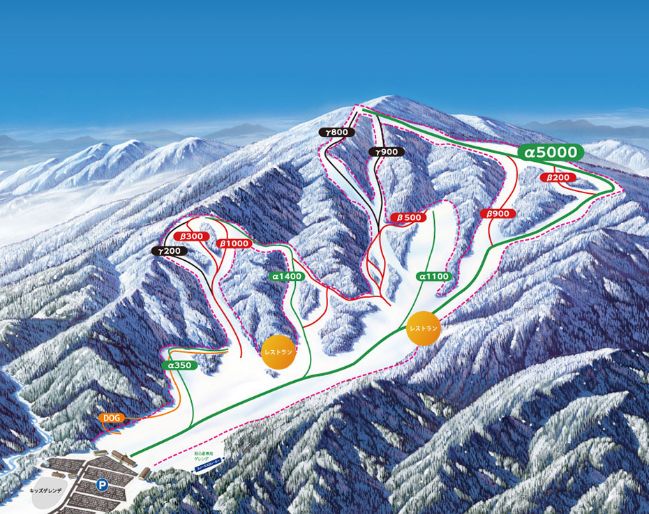 运行距离 5,000万 最大斜度 15度 平均斜度 8度 日本西部最长的路线是5000m路线,从初学者到专家都很着迷。景点之一是分布在球场周围的6个地形公园!
