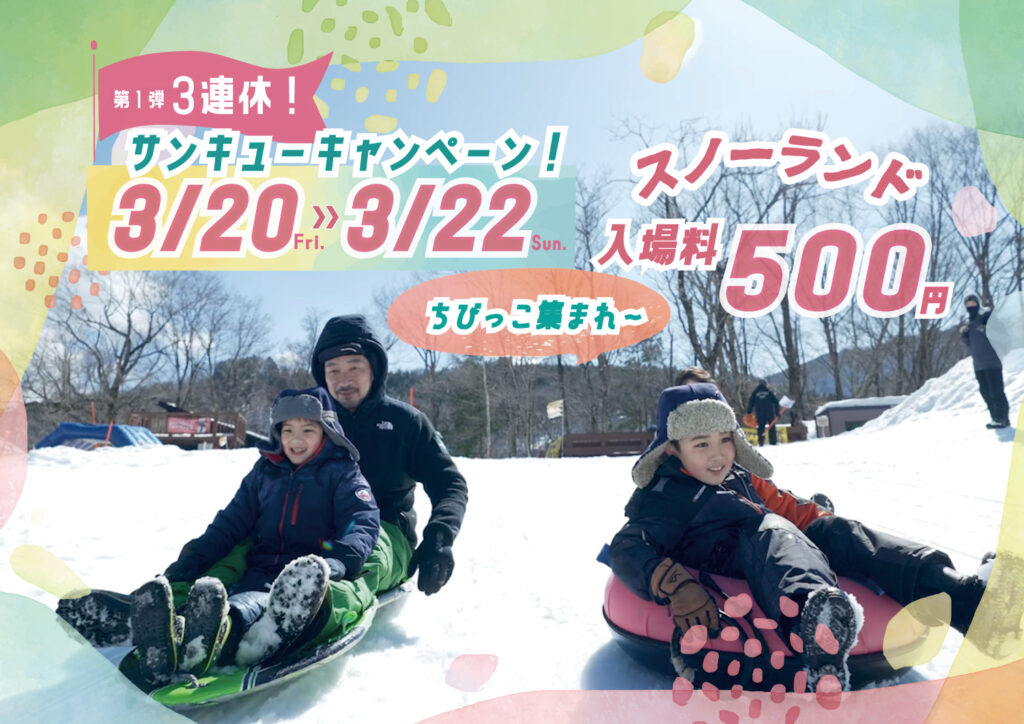 注意事项 【3月20日~22日】3連休は「スノーランド」入場料が500円! 3月20日~22日の3連休は、スノーランドの入場料が500円でご利用いただけます! 春の陽気に誘われて、ソリやチューブで遊んじゃおう♪https://www.meihoski.co.jp/kids/ 掲載日:2026/03/18